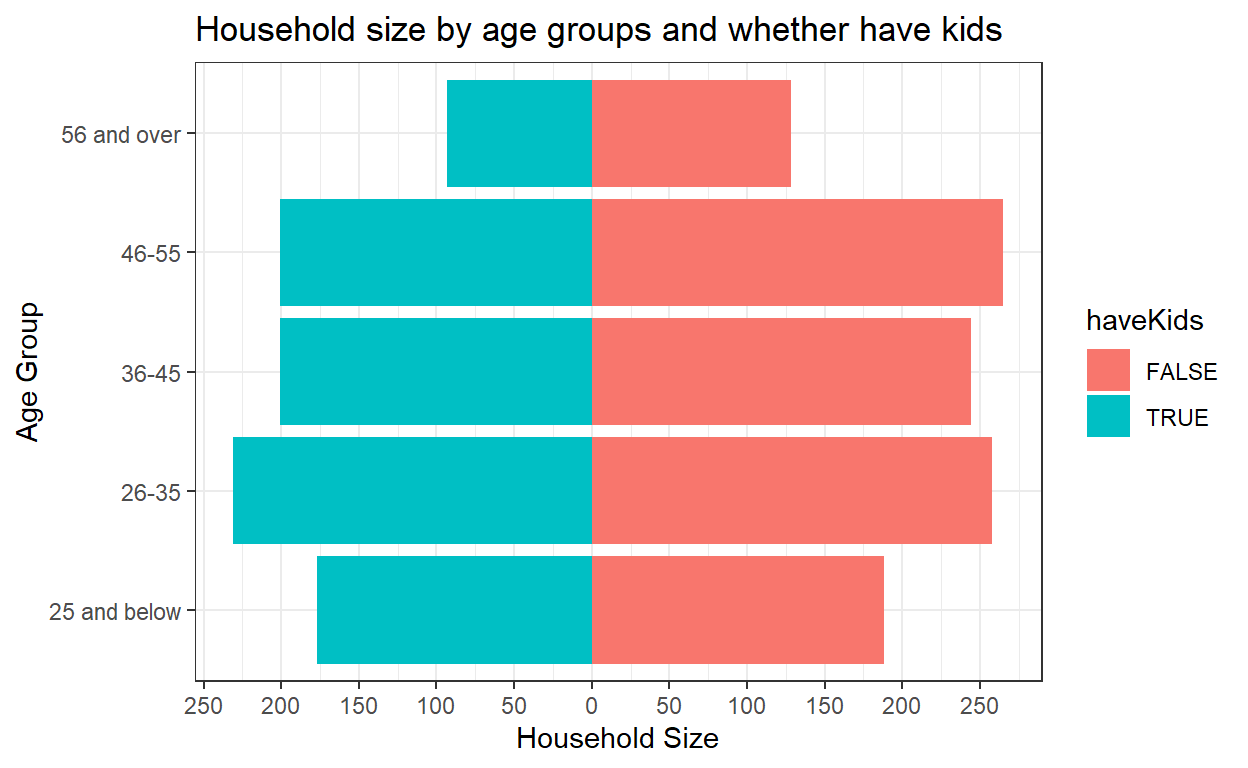 So we need the household size values of one group of participants (i.e. have kids) to appear on the left side of the chart, and the other (i.e. no kids) to go on the right. To achieve this, the household size values need to be transformed to negative values for participants with kids. mutate() function of dplyr package is used to transform to negative value.