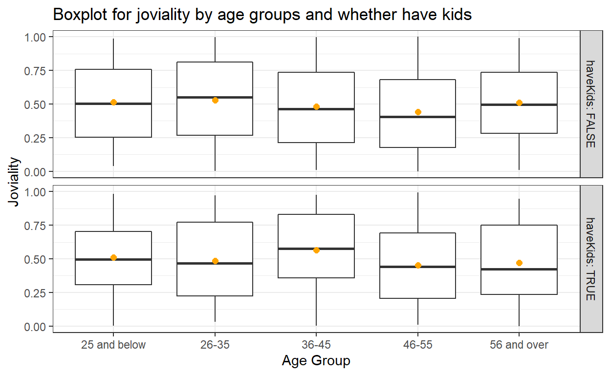 From the boxplots, we can tell for participants without kids, age group 26-35 has higher overall happiness level, whereas for participants with kids, age group 36-45 has higher overall happiness level.