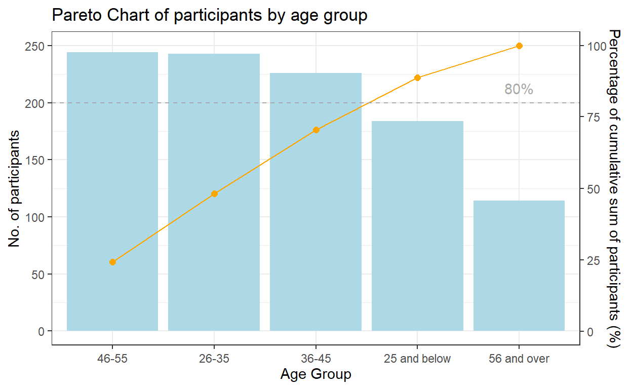A pareto chart was plotted using ggplot2 as follows for participants by age group: