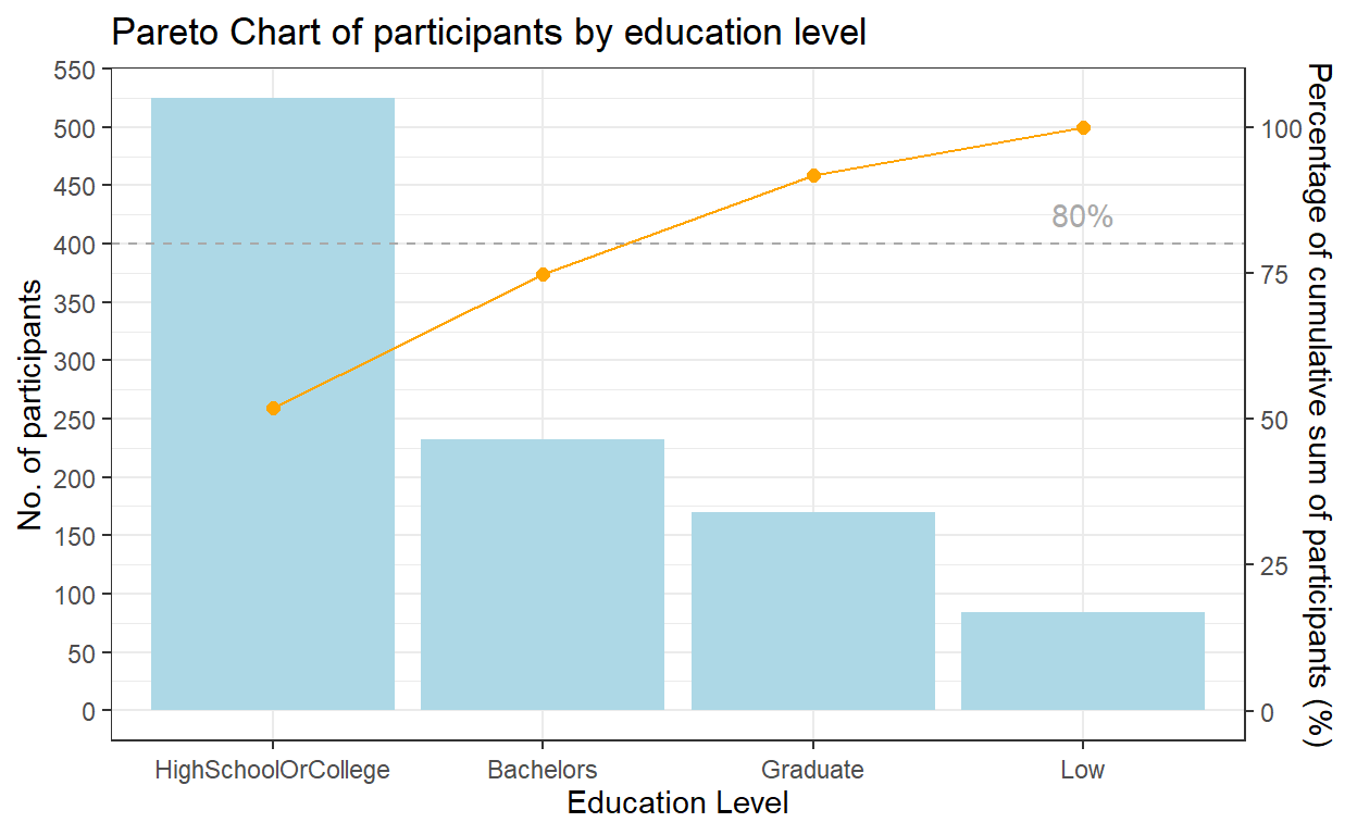 labs(x = "Education Level", title = "Pareto Chart of participants by education level") +