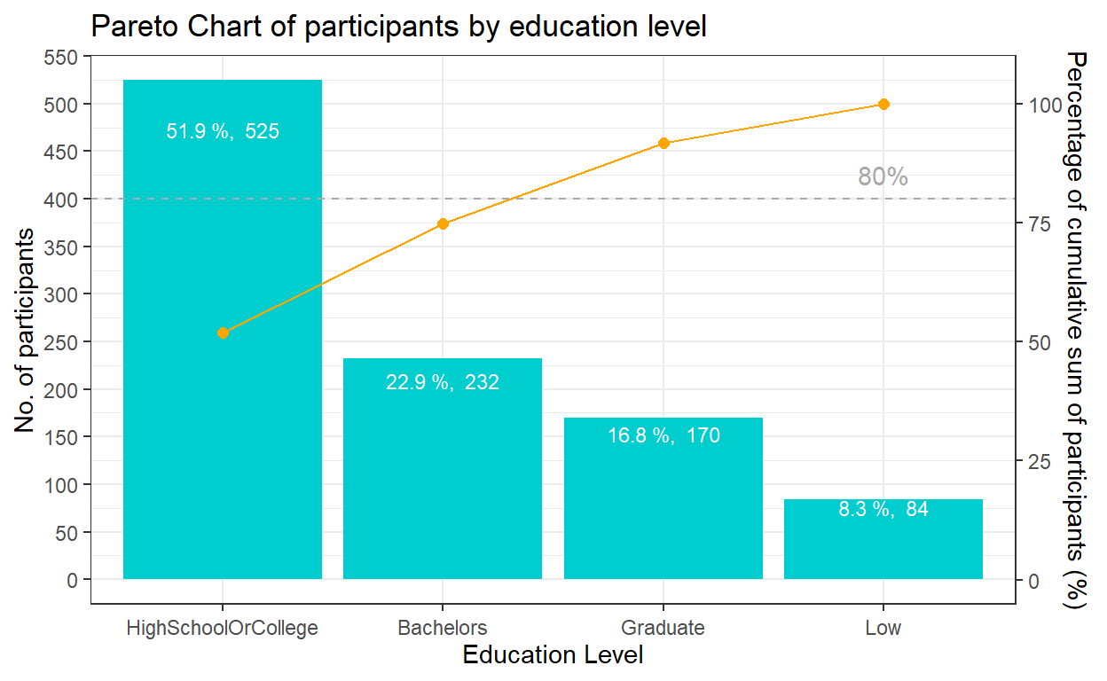 The best practice to show such distribution is using pareto chart. First, we need to compute the cumulative frequency of participants by education level and sort by count. This task will be performed by using mutate(), arrange() of dplyr package and cumsum() of Base R. The cumulative frequency is then divided by the sum of participants to obtain the cumulative percentage.