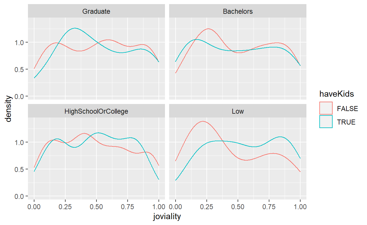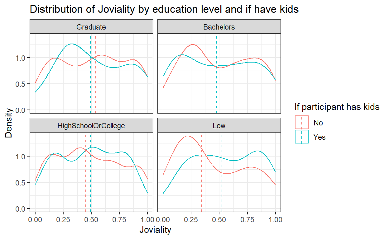 To show the distribution of joviality by education level, the original design was to create a density graph with 2 lines indicating whether the participant has kids and to further wrap the plots of different education levels into one plot together.