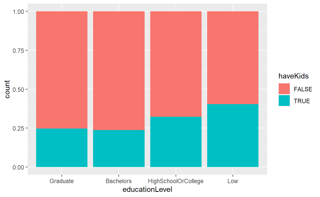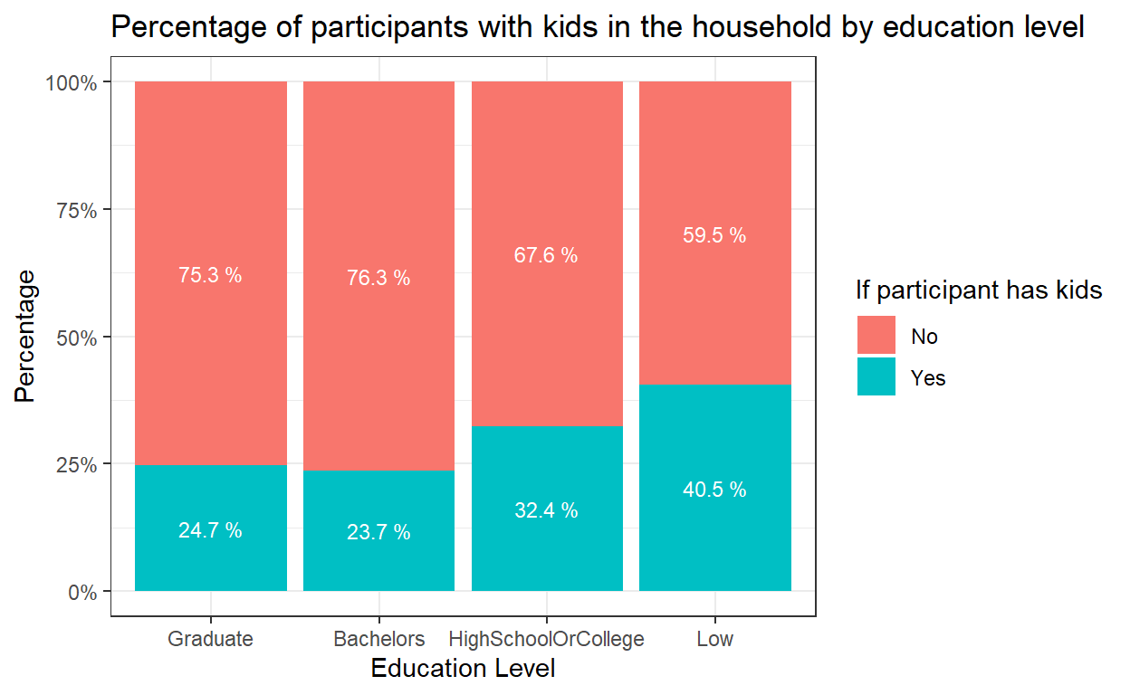 To compare the percentage of participants with kids in each education level, original design was to use geom_bar() to plot a 100% stacked bar chart.
