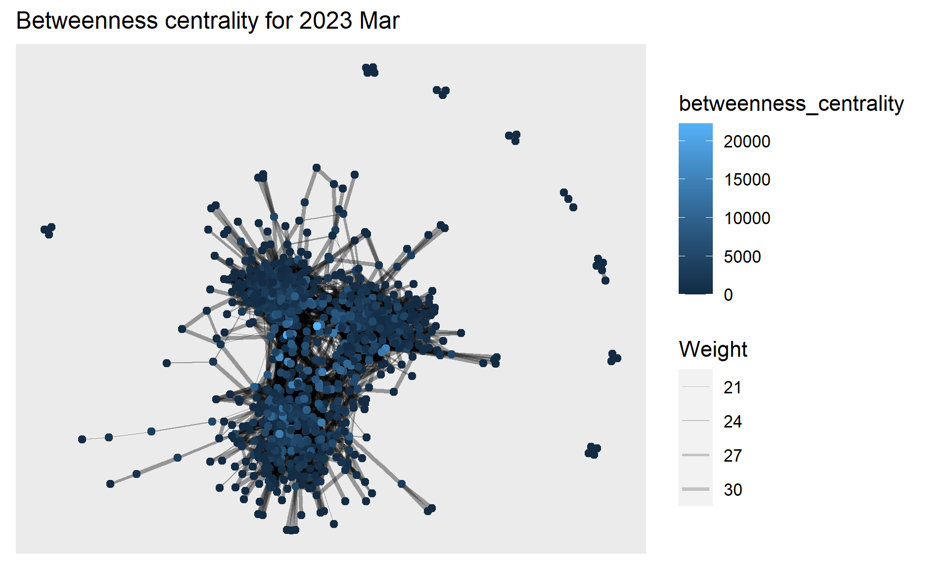 From the above graphs, we can see the highest betweenness centrality value dropped from 2022 Mar (~50,000) to 2023 Mar (~20,000), and in 2023 Mar the betweenness centrality has become more evenly distributed to the nodes.