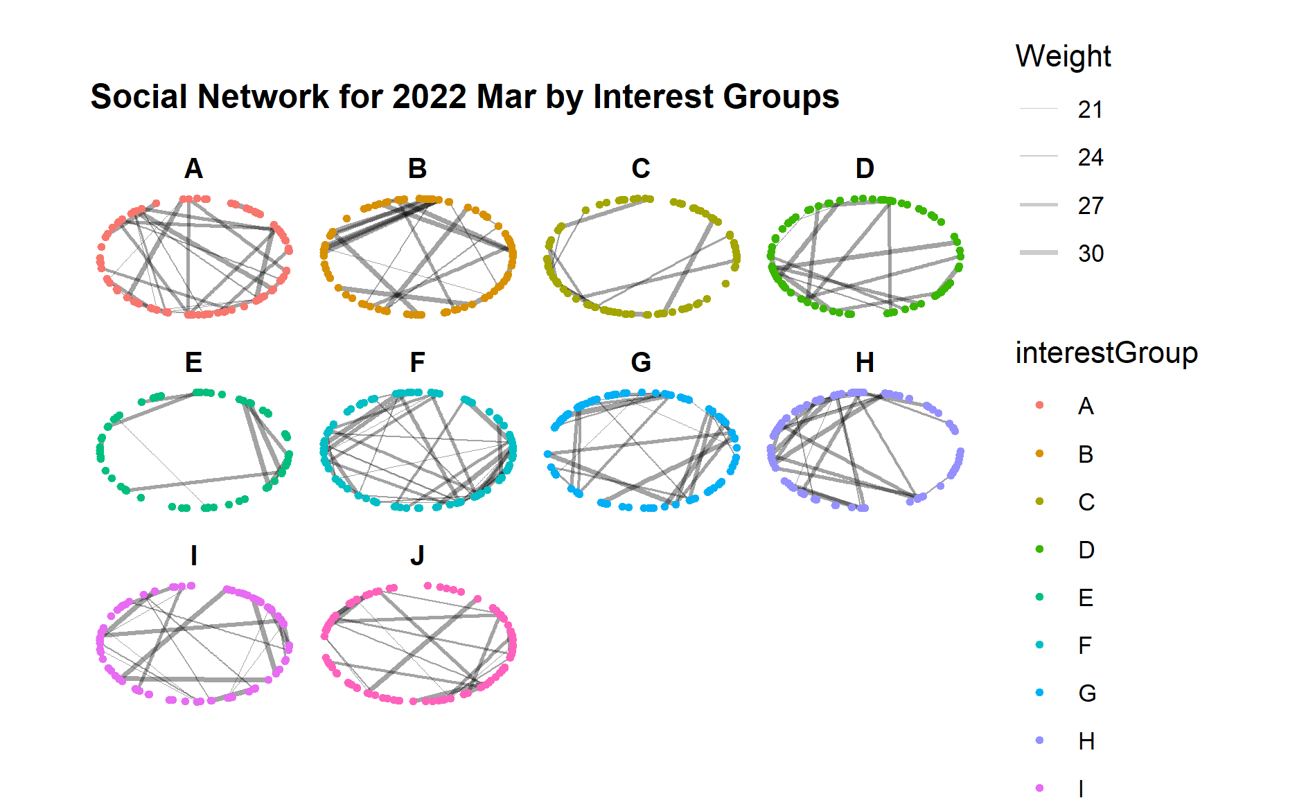 Below code chunk generates the network graph for 2022 Mar using facet_nodes() for different interest groups.