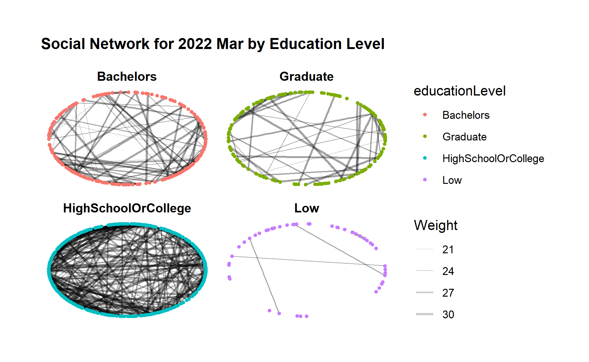 Below code chunk generates the network graph for 2022 Mar using facet_nodes() for different groups of education level.