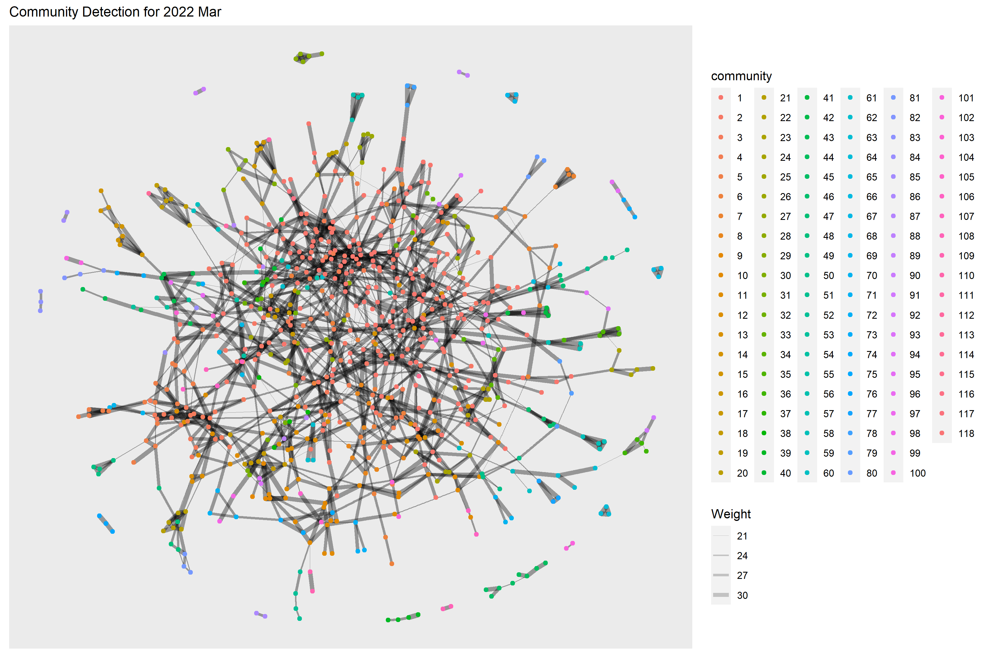 Below code chunk performs the community detection for 2022 Mar. 118 communities have been detected.